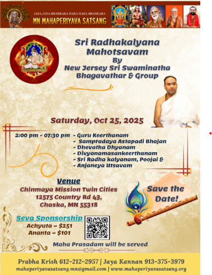 With the blessings of our Guru, we are delighted to announce this year's Sri Radha Kalyanam on Saturday, October 25th at Chinmaya Mission Twin Cities.